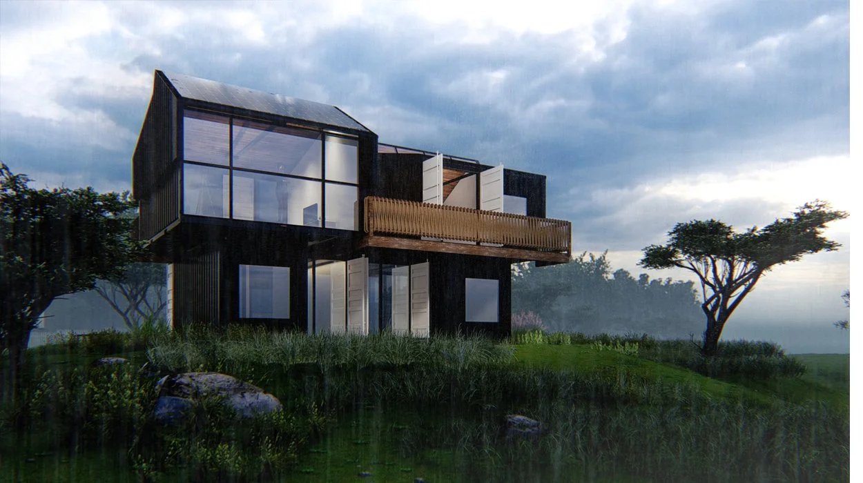 At 320 square feet, this efficient and simple home is constructed from one intermodal shipping container modified to sit within a 16’ x 20’ footprint. Both units sit cantelivered above one 8’ x 40’ container base which creates both foundation and additional storage / outdoor living for the two units.