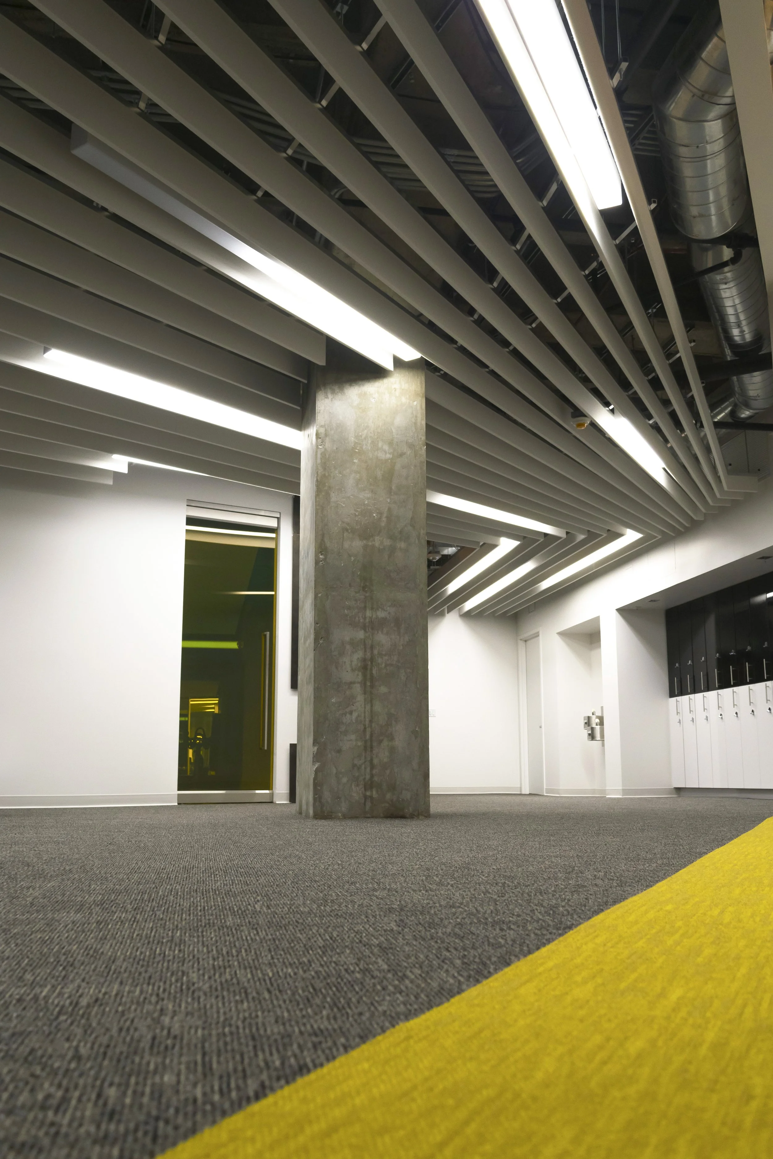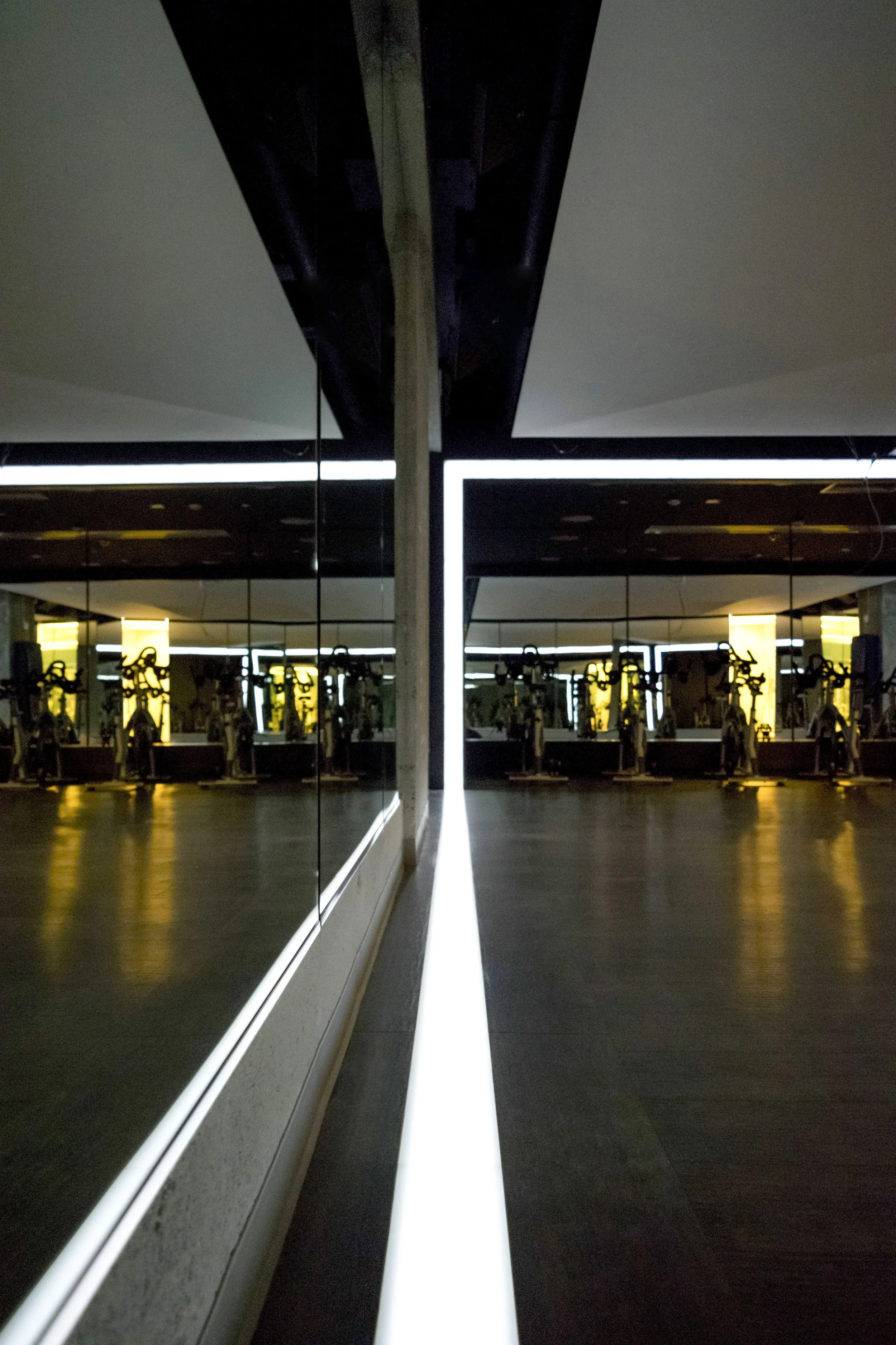Blackened steel panels, raw concrete, embedded led lights and simple touches of color complete the motivational atmosphere and give laser focus & determination to the emotion of the space.