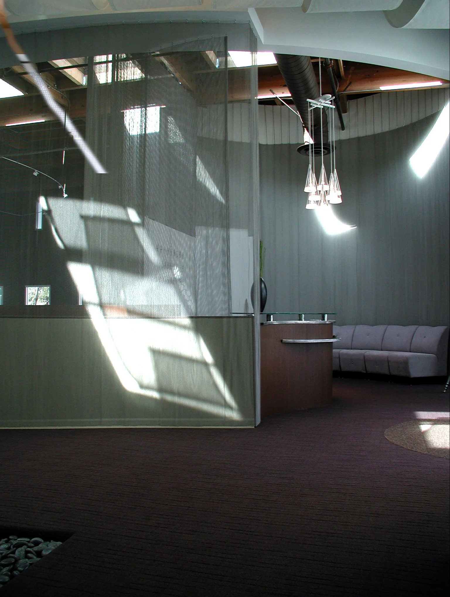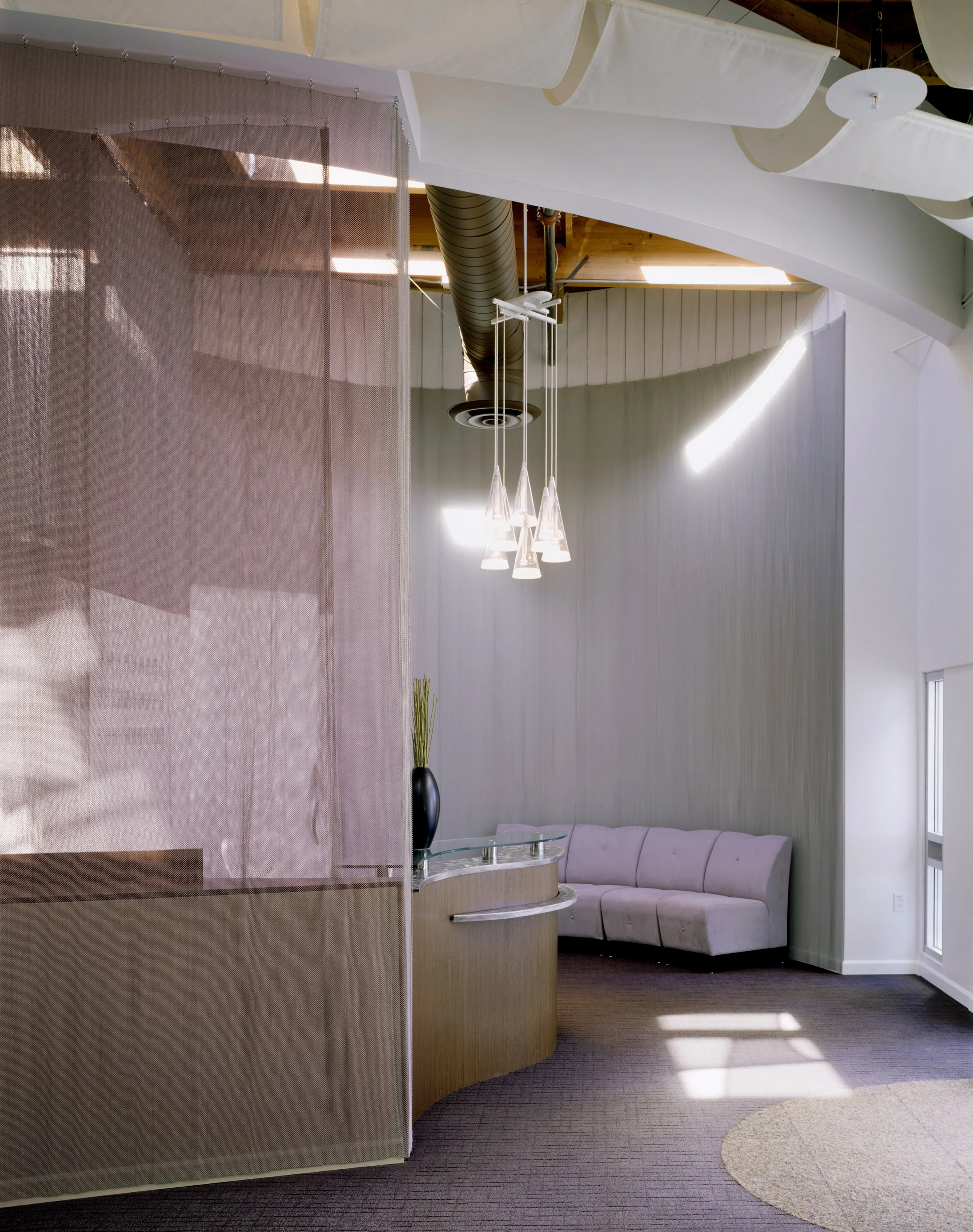 The dichotomous arcs form both a resource space with custom casework for the public teaming area, as well as the screen walls and ramps of the private work areas. the gentle movement between shallow ramps and elevations catch, filter, and celebrate the daylight that dance and dapples on the surfaces as the days and seasons progress.